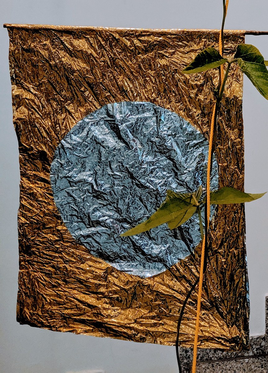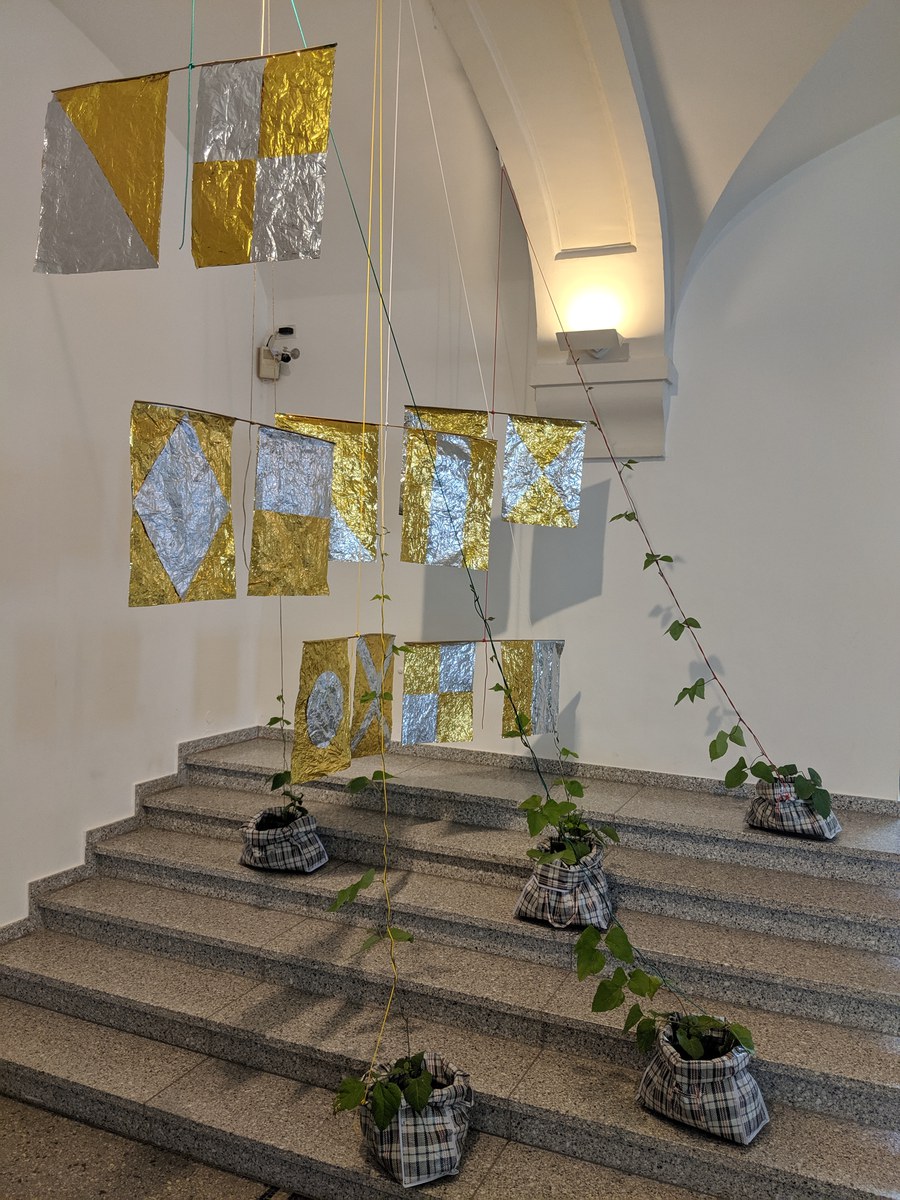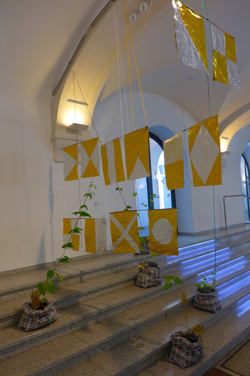 The Installation was a part of a goup exhibition about flags and riches. The growing beans were ment to hoist the gold-silver flags slowly up.