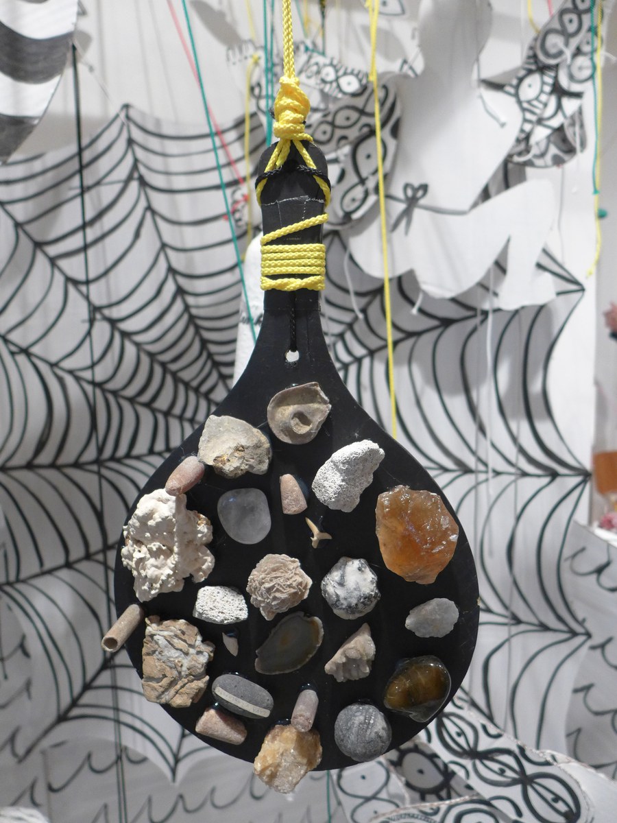 Pull the string and participate the game. An interactive mobilé. All the parts are movable but which string belongs to which object? Westwerk, Hamburg 2016