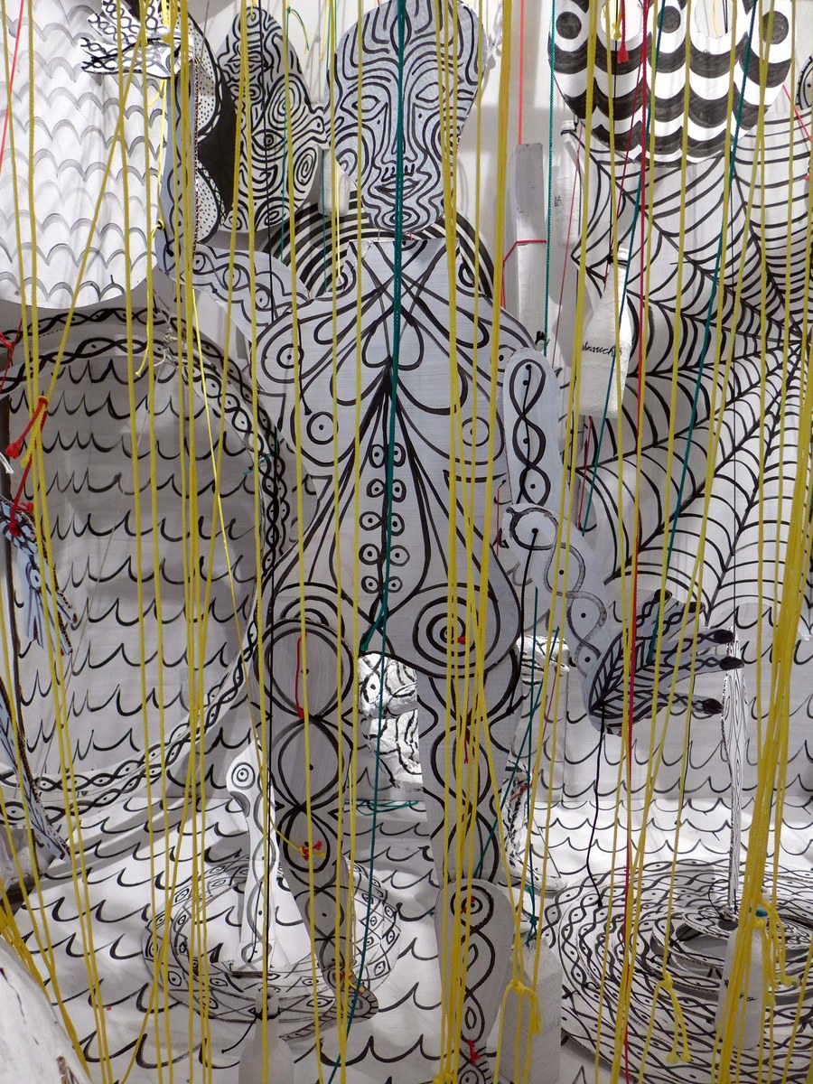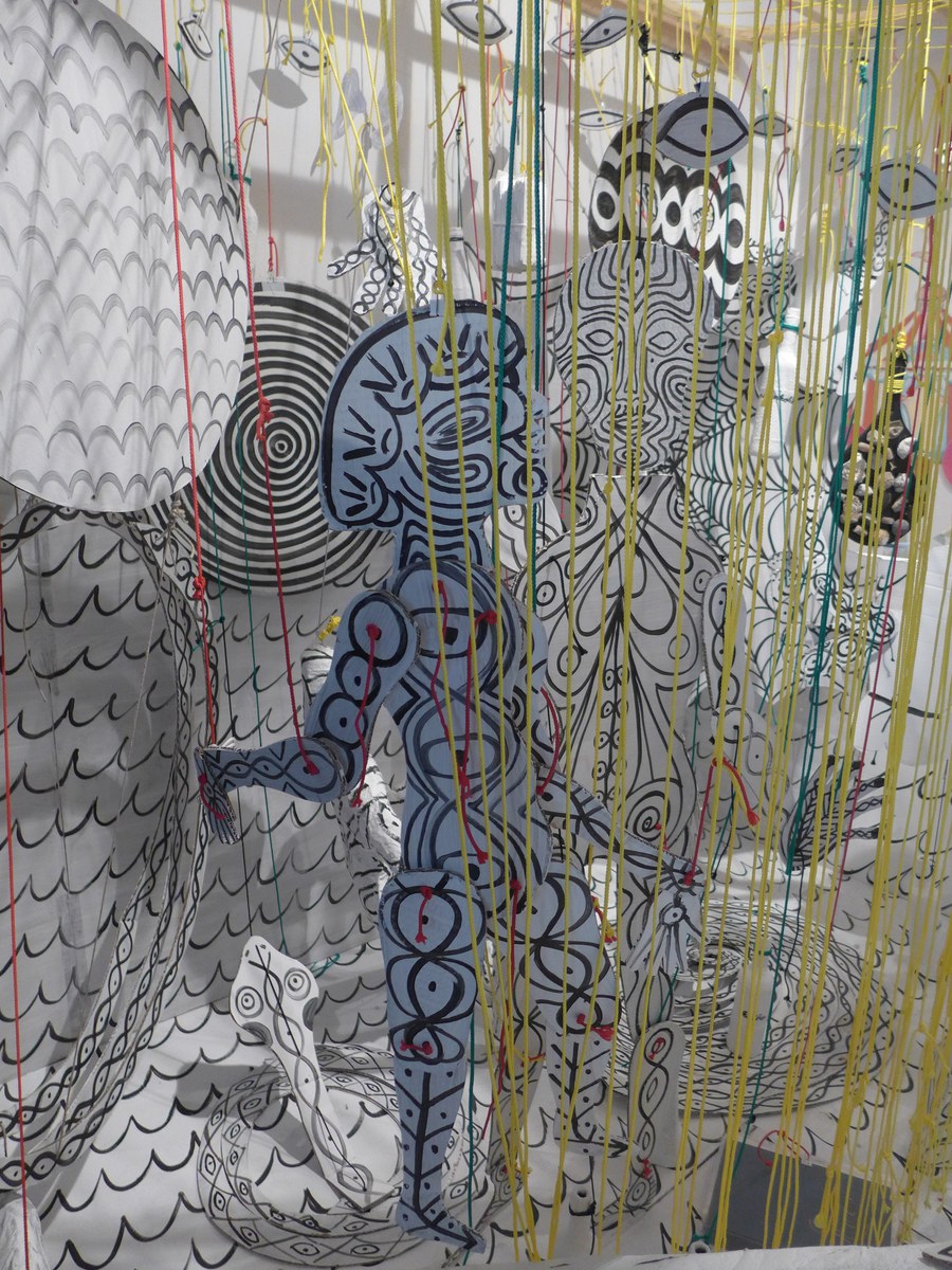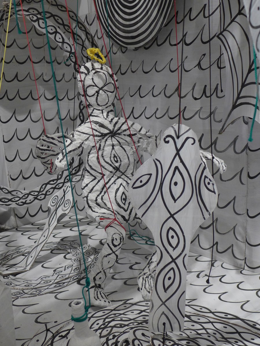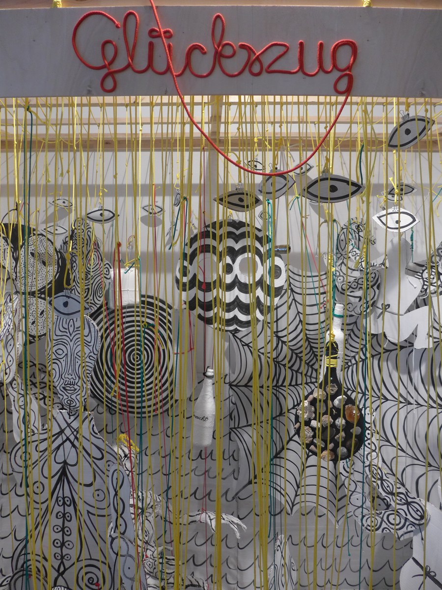 Material: carboard figures and painted carboard, sailors ropes, objects, drawings, plaster, bottles. Visitors could join and pull the string. Original drawing as Jackpot